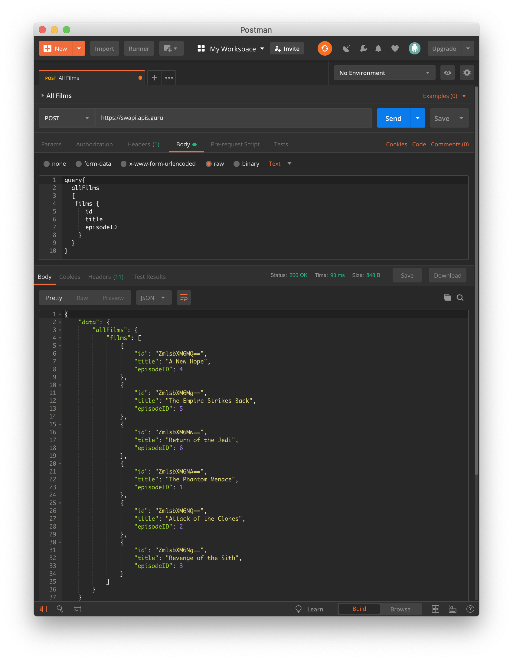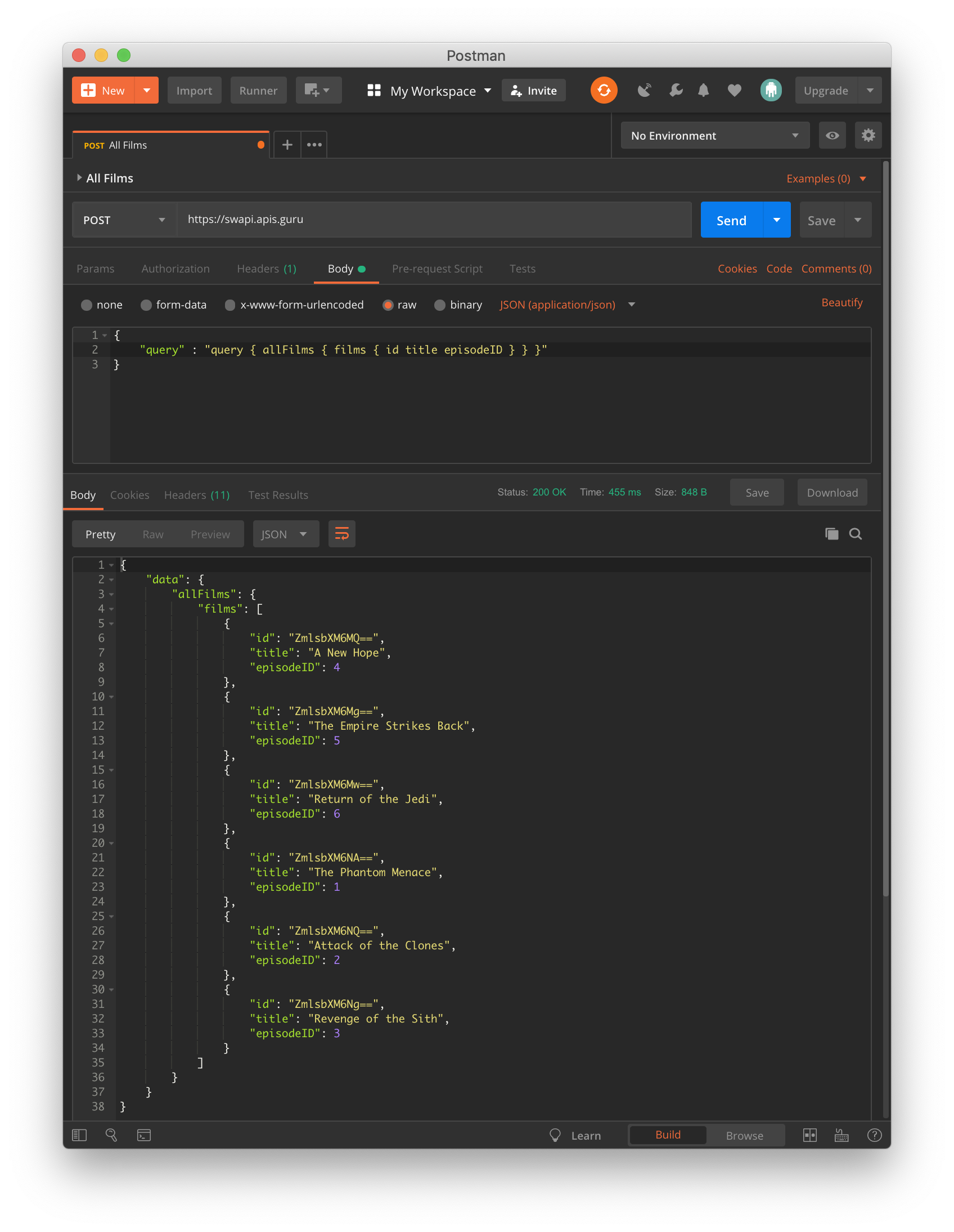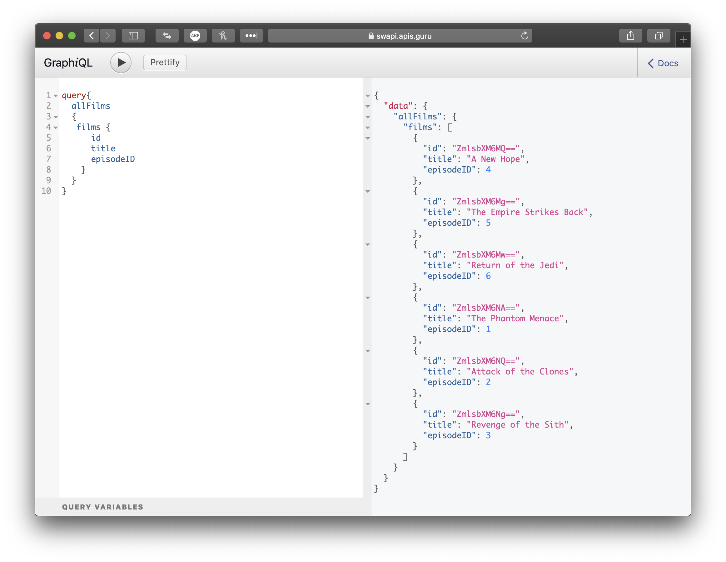 "query" : "query { allFilms { films { id title episodeID } } }"