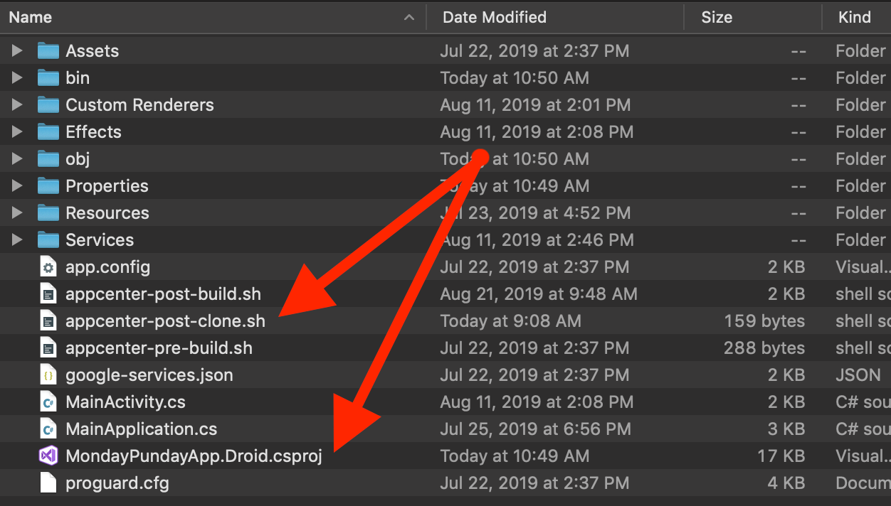 2. (Repeat for iOS) In the same directory as the iOS .csproj, create a new file called appcenter-post-clone.sh