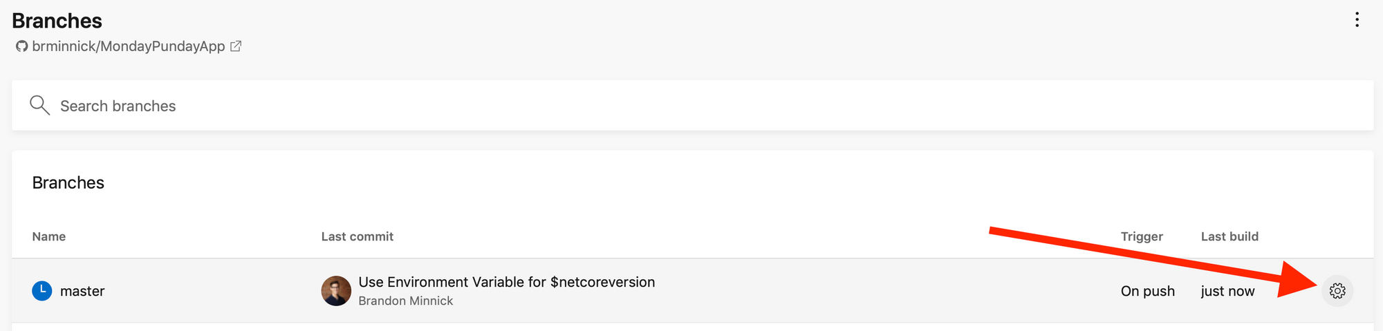 2. On the Build Branches page, select the Settings Gear next to the branch you'd like to configure