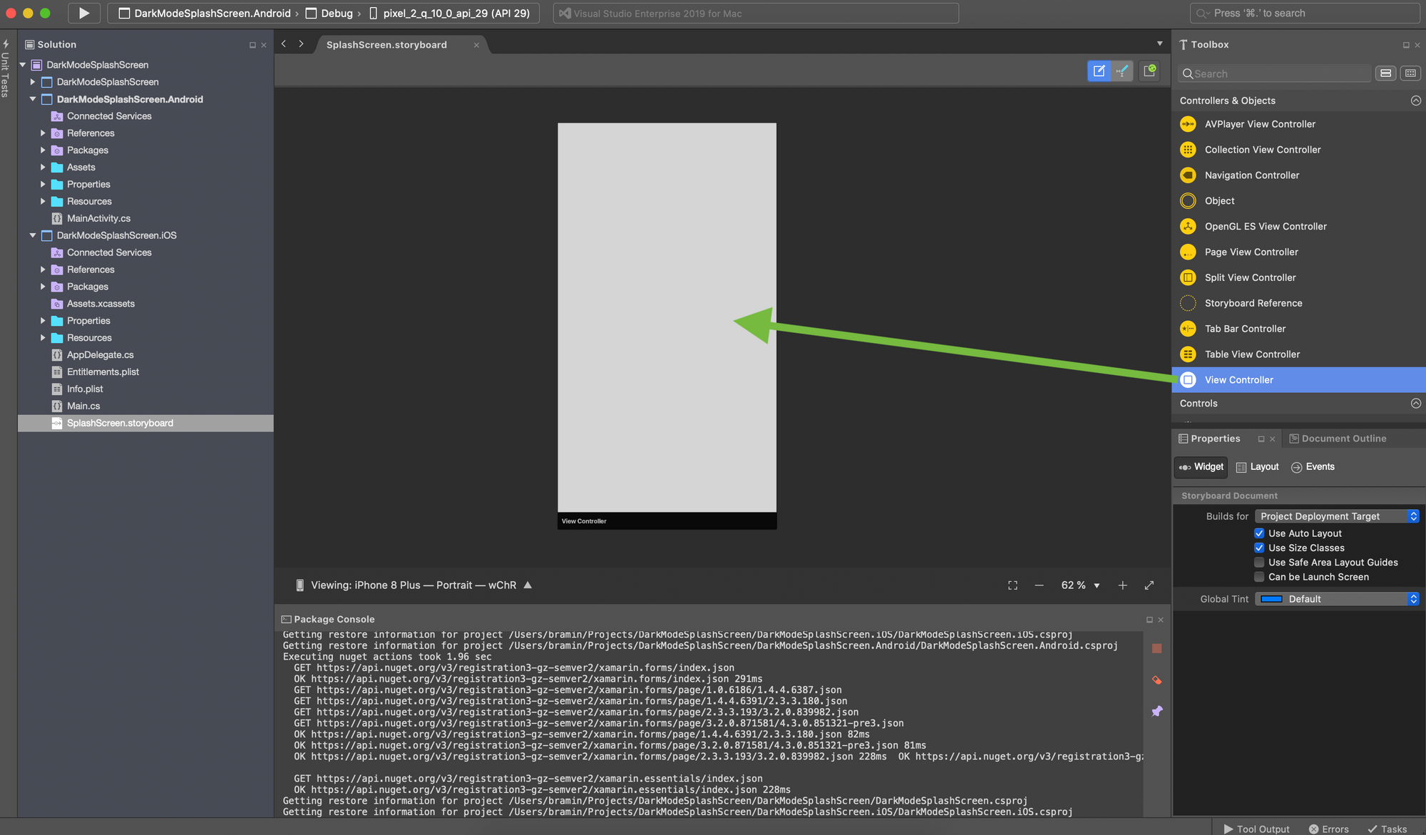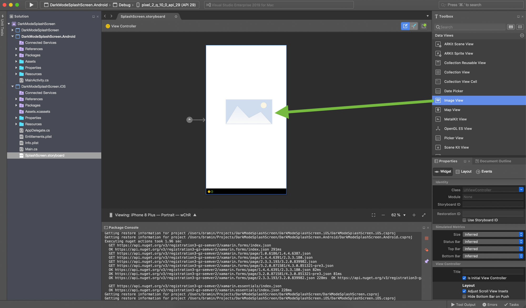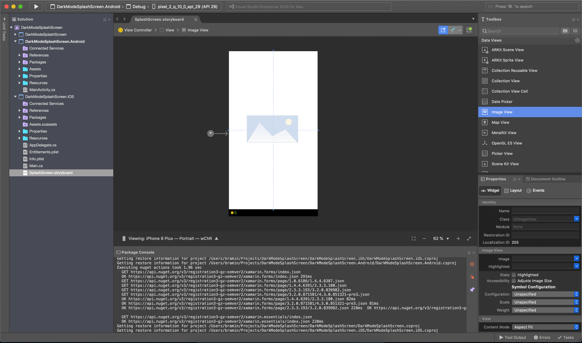 9. In the Visual Studio Solution Explorer, in the Xamarin.iOS project, open SplashScreen.storyboard
