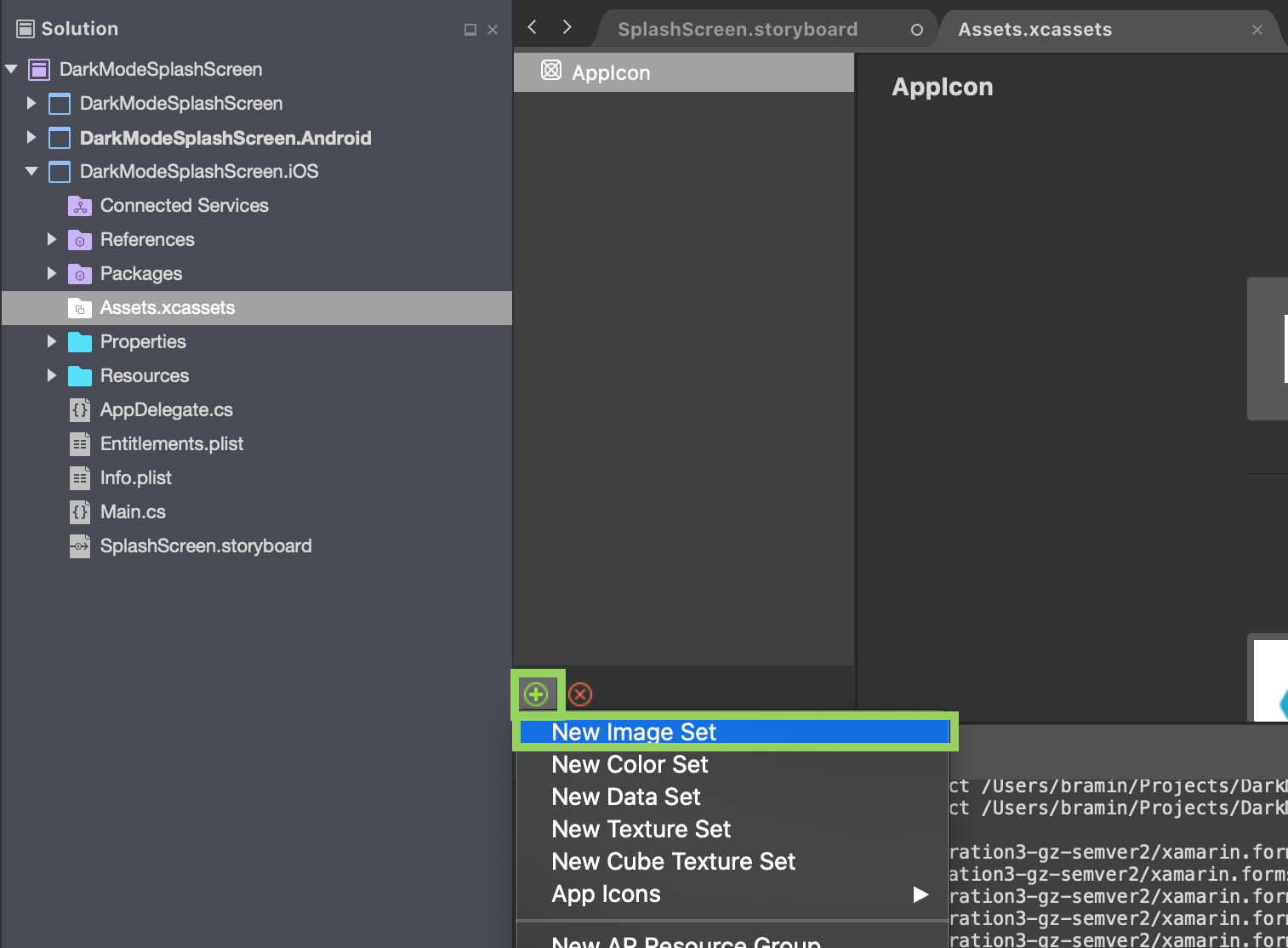 - (PC) In the Visual Studio Solution Explorer, in the Xamarin.iOS Project, open Asset Catalogs > Assets