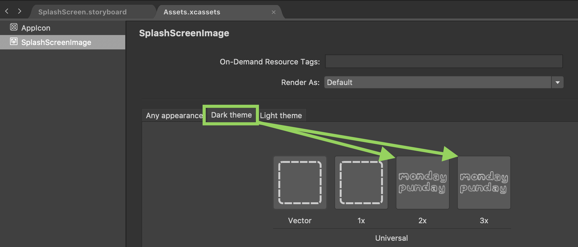 6. In the Dark Theme window, add an image for 2x and 3x