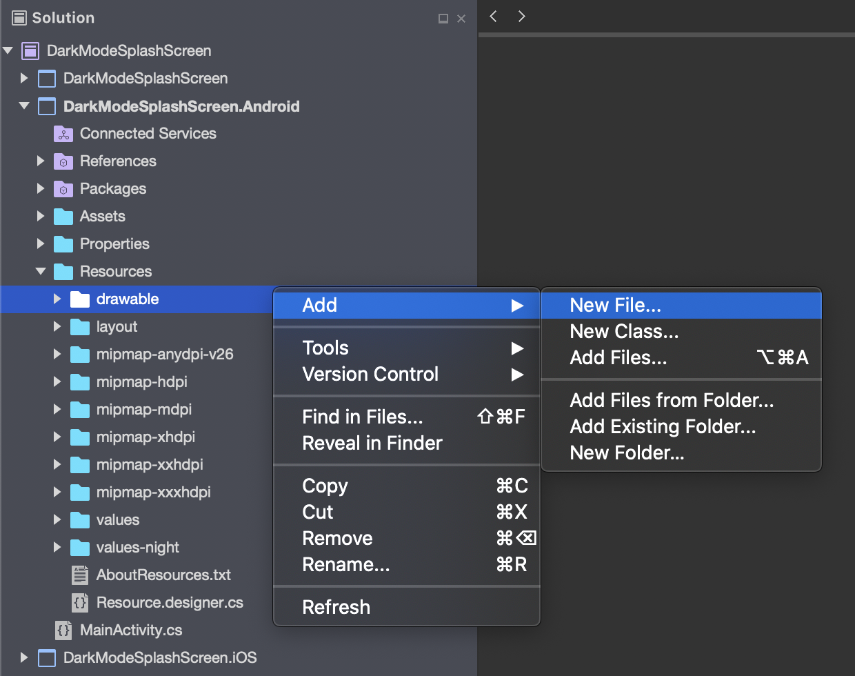 6. In the Visual Studio Solution Explorer, in the Xamarin.Android project, right-click Resources > drawable