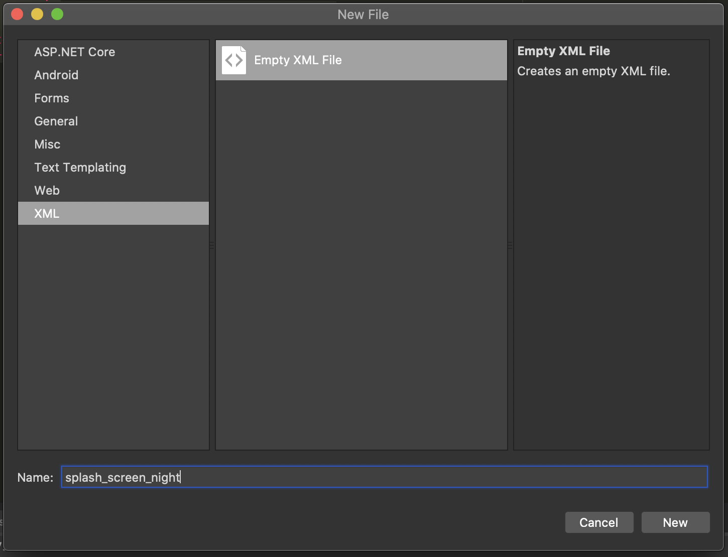 8. In the New File window, create a new XML called splash_screen_night.xml