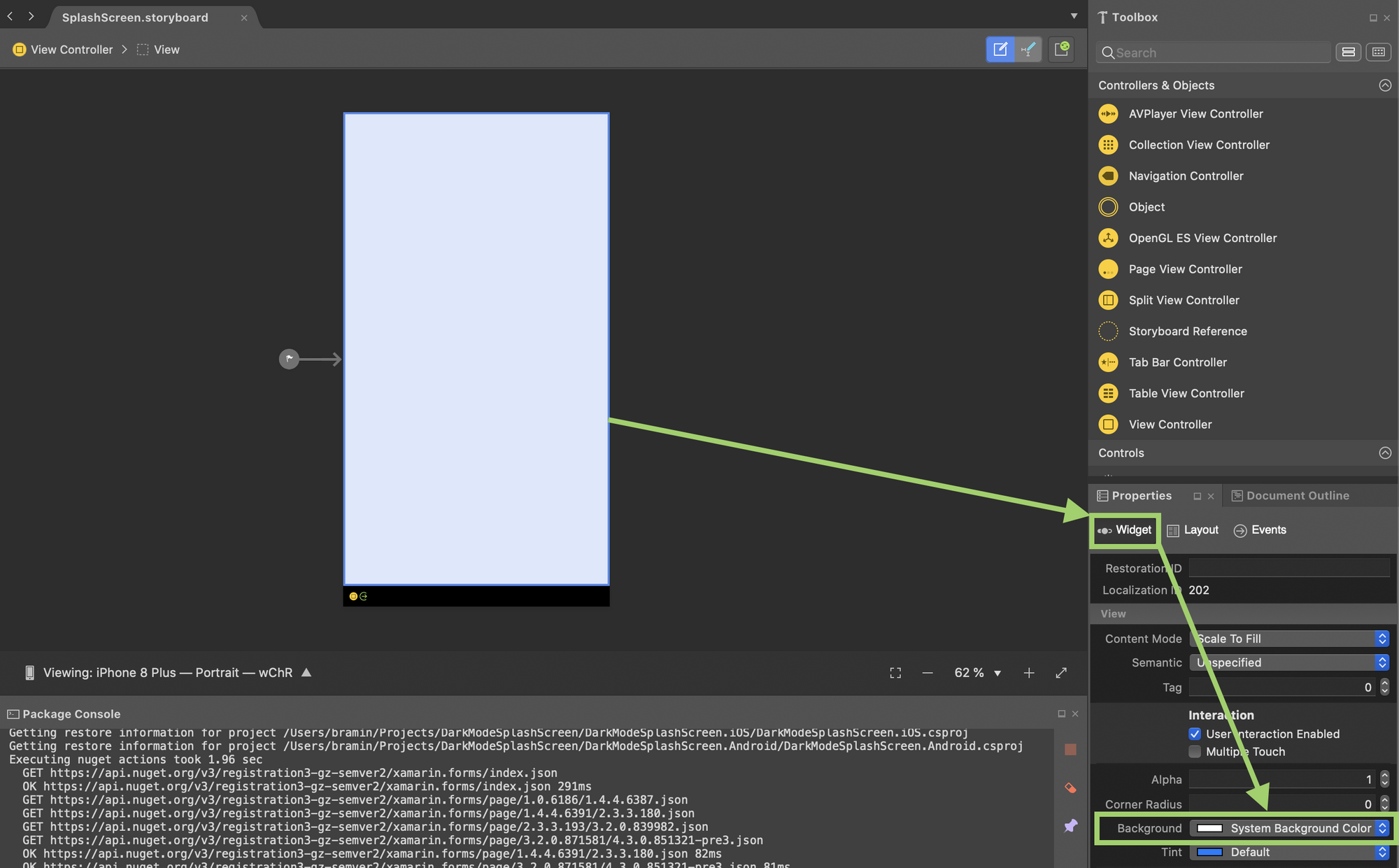 8. In the SplashScreen.storyboard Editor, click on the View Controller to select it