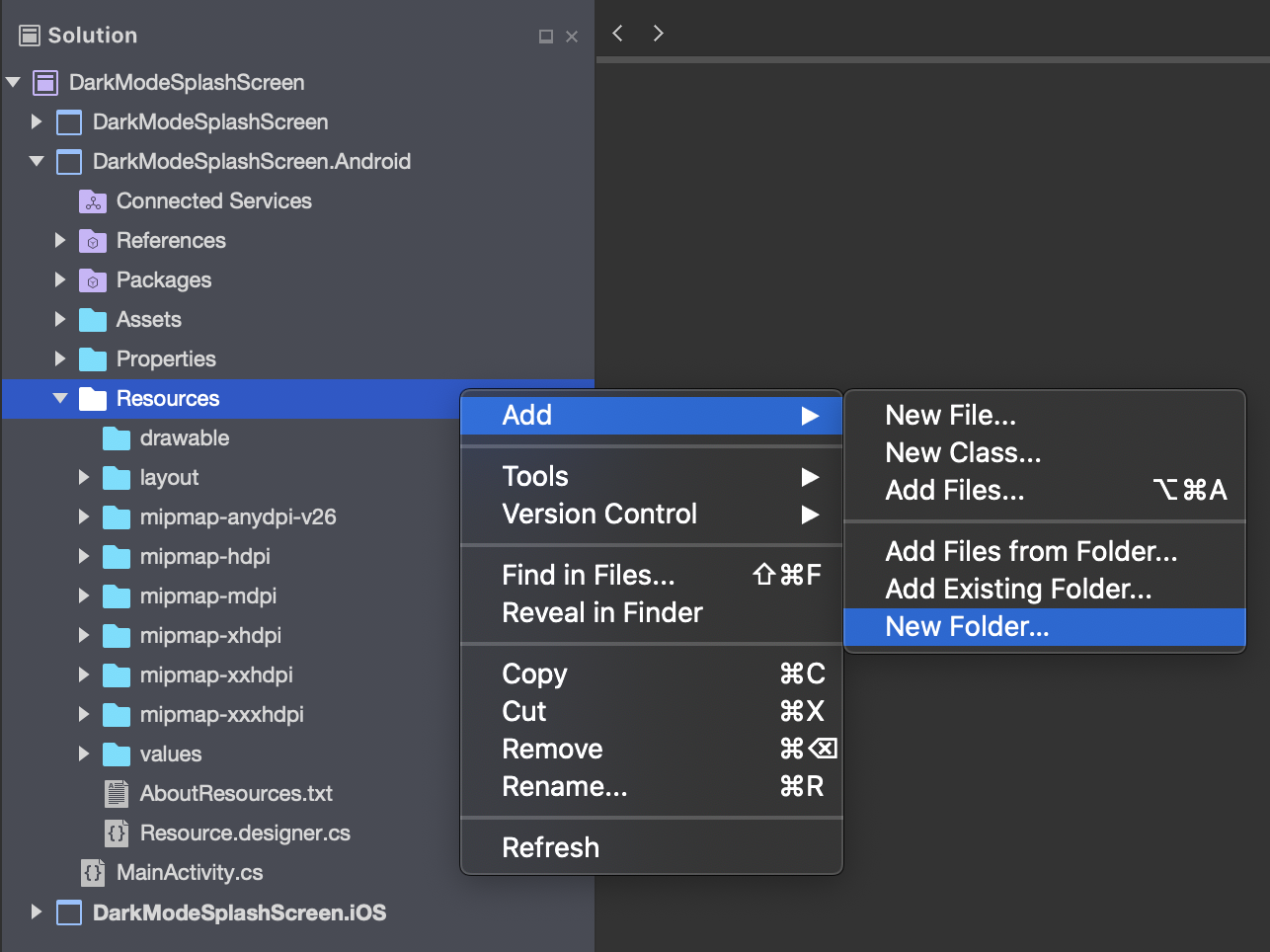 - In the Visual Studio Solution Explorer, in the Xamarin.Android project, right-click on Resources