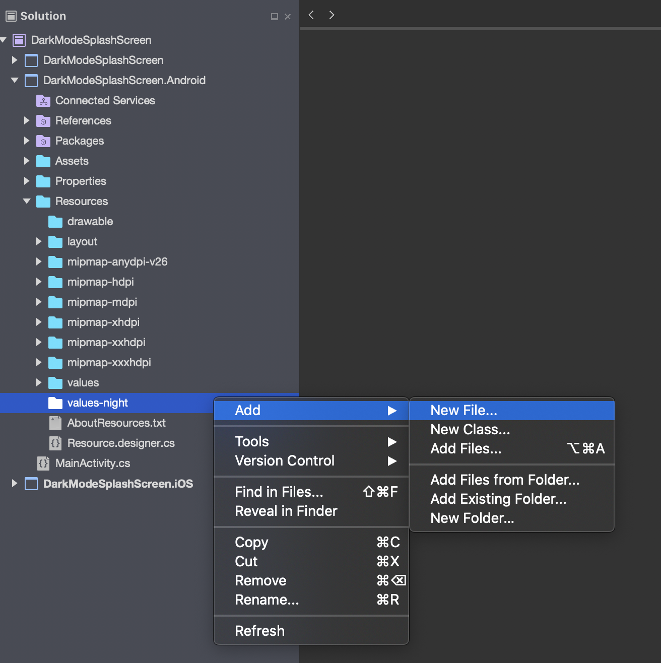 4. In the Visual Studio Solution Explorer, right-click on the newly created folder, values-night
