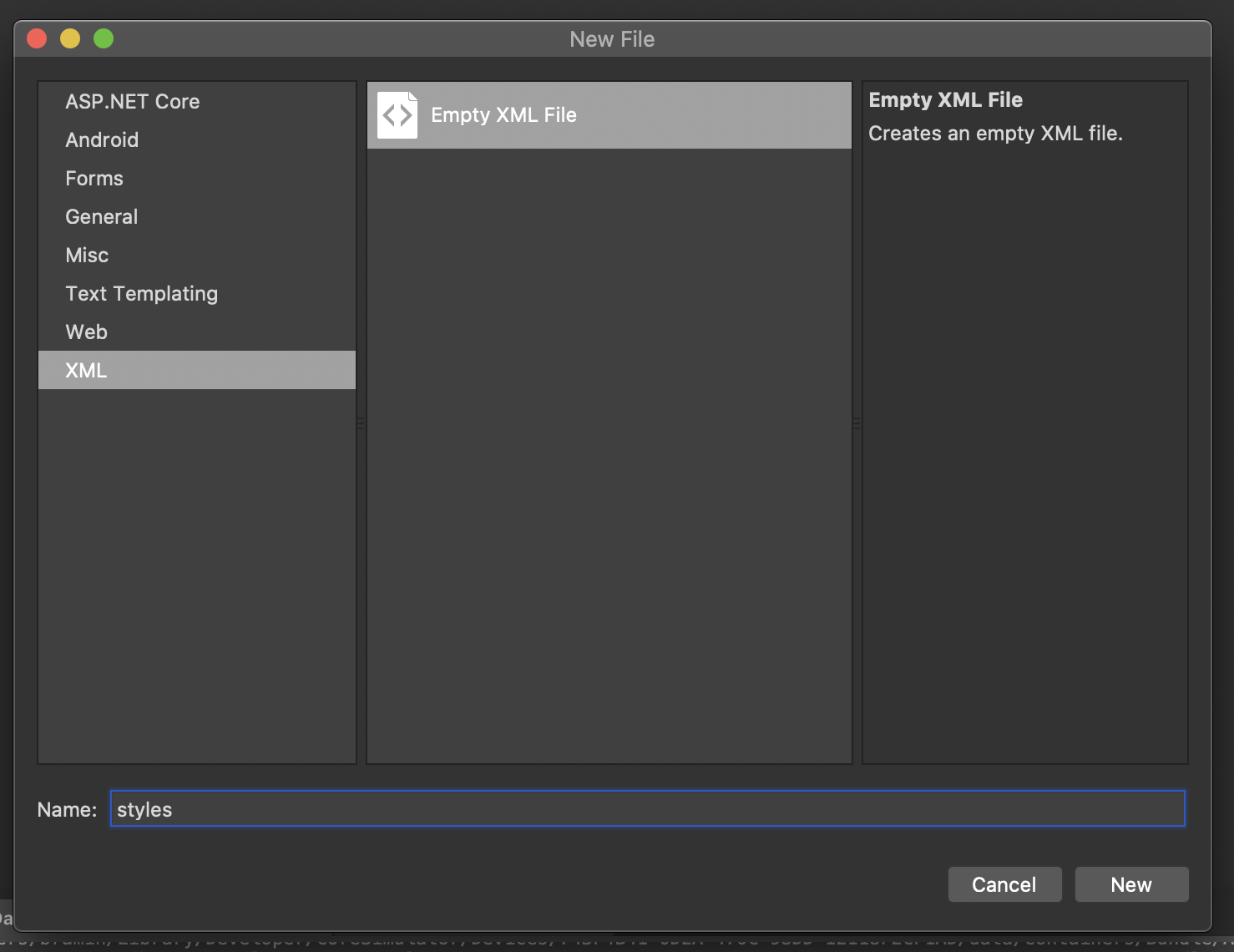 6. In the New File window, create a new Empty XML File named styles.xml