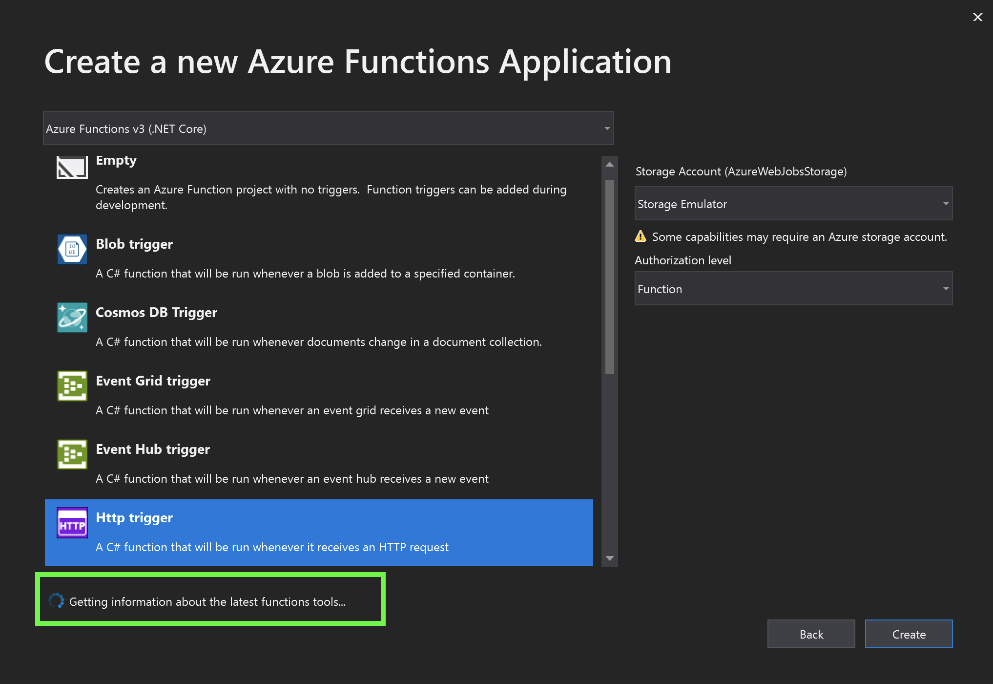 5. In the Create a new Azure Functions Application window, stand by while it is "Getting information about the latest function tools..."