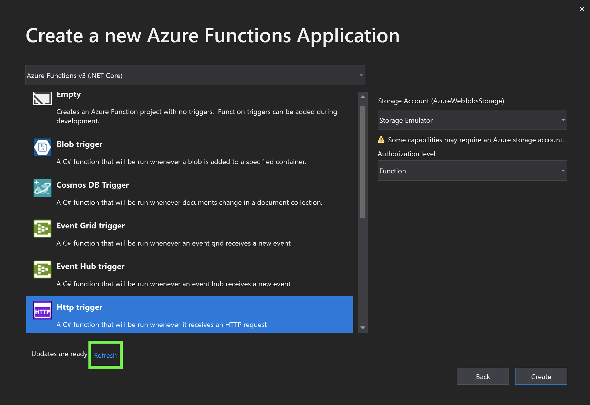 6. In the Create a new Azure Functions Application window, once the new tools have been downloaded, click Refresh