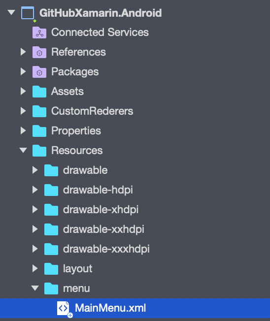 In the Xamarin.Android project, we'll first need to add MainMenu.xml to Resources > menu.
